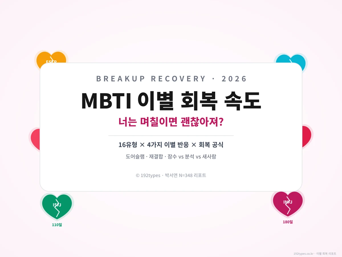 이 글은 16유형의 이별 회복 기간을 줄 세운 랭킹이야. 192가지 성격 유형 검사 데이터 348명 + 인지기능 보정으로 산출했어. 1위 ESTP(2일), 꼴찌 INFJ(180일). 회복 유형 4가지(울음/분석/은둔/새사람), 도어슬램(Door Slam) 위험도, 재결합 확률까지 다 풀어줄게. MBTI 연애 속도 순위에서 시작 속도를 봤다면 이 글은 끝 속도야. 같이 보면 네 연애 패턴이 완벽하게 보여.