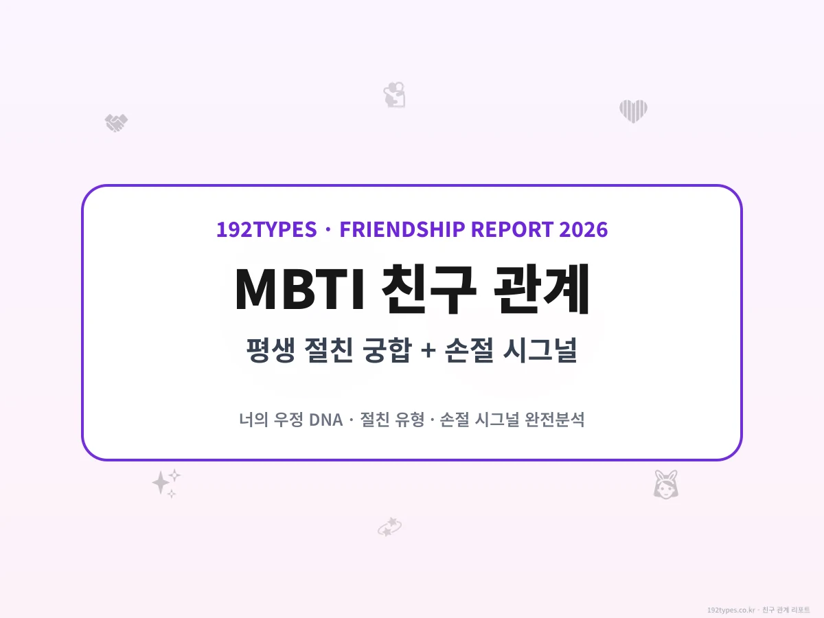 16유형의 절친 가능성 랭킹(ENFJ 96 → INTP 22), 절친 궁합 BEST 8 조합, 4가지 우정 DNA(돌봄/성장/신뢰/현재), 손절 시그널 6종, 기질별 우정 유지 체크리스트. 왜 나와 그 친구가 안 맞는지, 왜 이 친구랑은 10년 가는지 인지기능으로 풀어냈어.