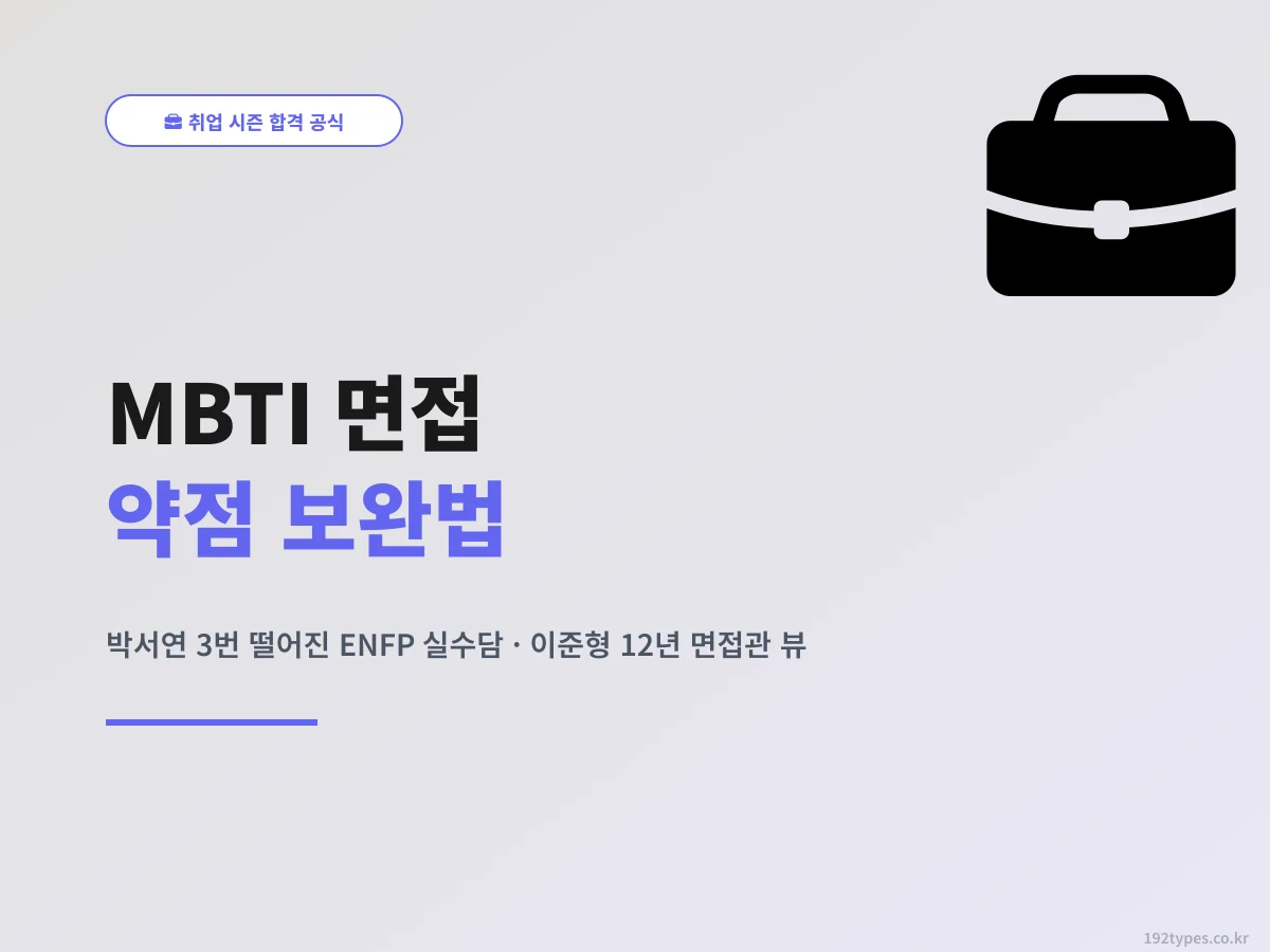 면접 자꾸 떨어지는 MBTI는 따로 있어. NT 논리 강점/감정 약점, NF 가치관/성과 설명 약점, SJ 안정성/창의성 약점, SP 순발력/장기계획 약점. 박서연 신입 1년차 실수담 + 이준형 선배 면접관 뷰.