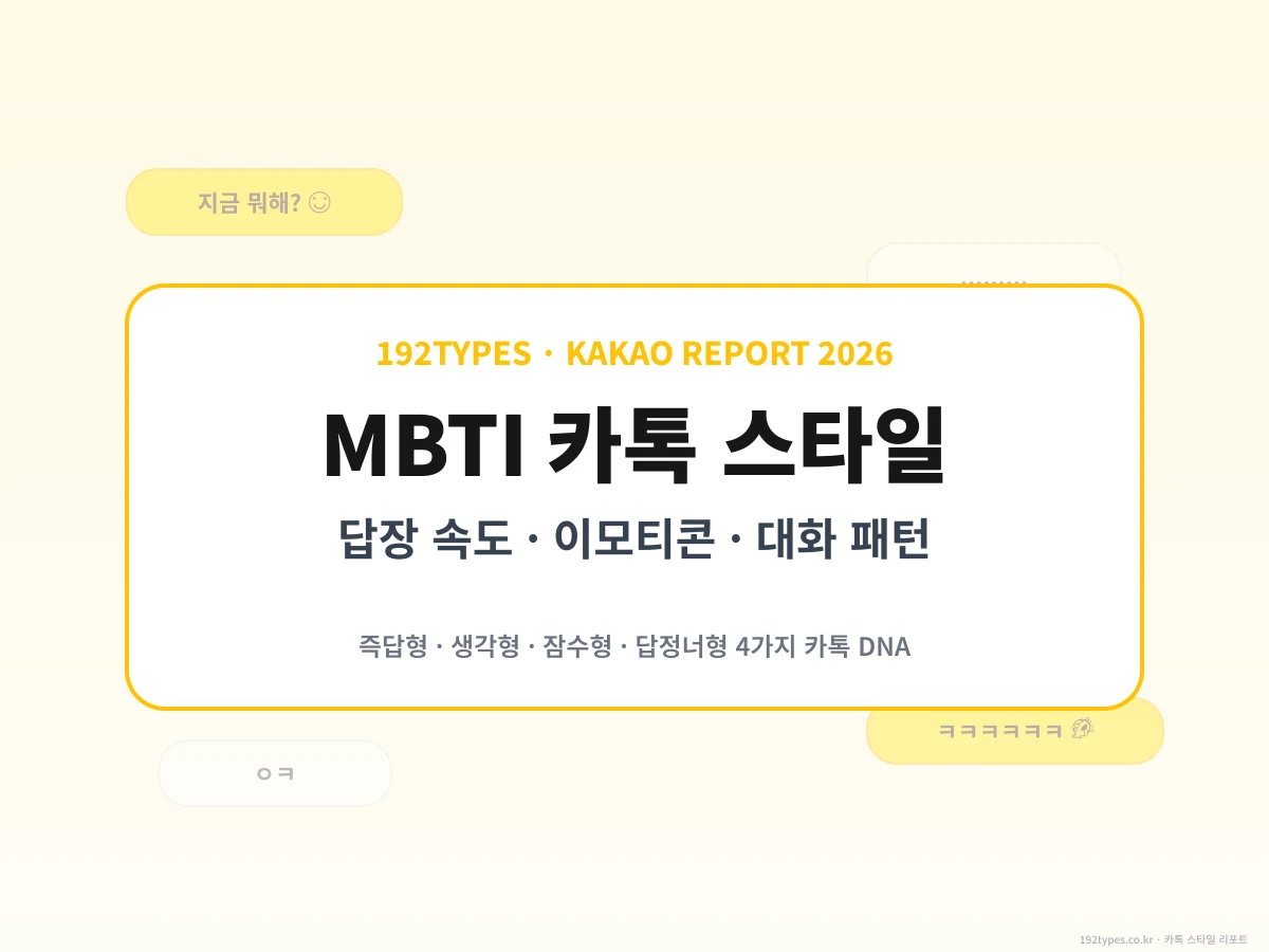 16유형이 카톡에서 어떻게 답장하고, 어떤 이모티콘을 쓰고, 왜 잠수타는지 전부 해부했어. 답장 속도 랭킹(ESFJ 30초 → INFP 3일), 4대 대화 모드(즉답/생각/잠수/답정너), 읽씹 위험도 매트릭스, 기질별 카톡 가이드까지.