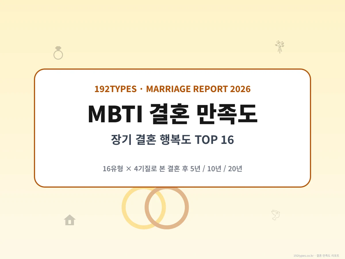 이 글은 16유형의 결혼 DNA 지도야. 결혼 만족도 랭킹(ISFJ 94점 → INTP 24점), 4가지 결혼 스타일(로맨스형·파트너형·가족형·독립형), 4기질별 이혼 위험도, 부부 갈등 6대 포인트(돈·집안일·자녀·감정 표현·휴식·시가), 기질별 실전 유지 루틴까지. MBTI 궁합 순위가 "연애 궁합"이라면 이 글은 "20년 결혼 궁합"이야. 결혼 전에 한번, 5년차에 다시 읽으면 결혼 생존율이 달라져.