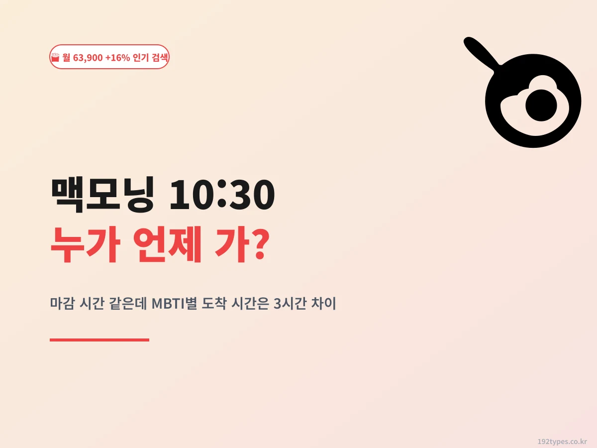 네이버에서 "맥모닝 시간" 검색이 월 63,900회야. "언제 끝나?" 질문이 하루 2천 건 이상 올라오는 거지. 근데 진짜 흥미로운 건 누가 언제 가냐가 MBTI로 거의 예측 가능하다는 거야. 이 글은 우리 회사 동료 20명 + 민지 간호사 팀 관찰로 뽑아낸 맥모닝 타이밍 완전 분석이야. 네가 몇 시에 도착하는 타입인지 네 유형으로 확인해봐.