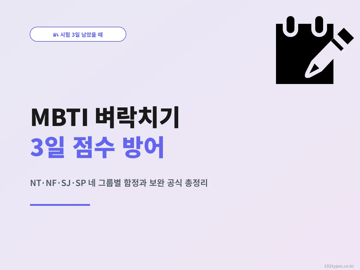 시험 3일 남았을 때 MBTI마다 책상 풍경이 왜 다를까. NT·NF·SJ·SP 네 그룹별 공부 함정과 벼락치기 보완 공식, 기질별 당일 컨디션 관리까지. 박서연·민지·이준형 선배의 실제 시험 실패·성공 회고 포함.