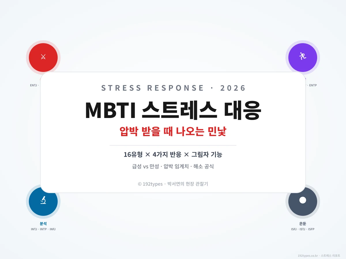 이 글은 16유형이 스트레스 받을 때 어떻게 무너지는지 전체 지도야. 4가지 반응 모드(공격/회피/분석/은둔), 16유형별 민낯(그립 기능 매핑), 스트레스 민감도 랭킹, 급성 vs 만성 반응 4분면, 기질별 즉시 적용 해소 루틴까지. MBTI 번아웃 취약도 순위가 "장기 소진"이라면 이 글은 "즉각 반응"이야. 둘이 짝으로 읽으면 네 심리 방어 시스템이 완벽하게 보여.