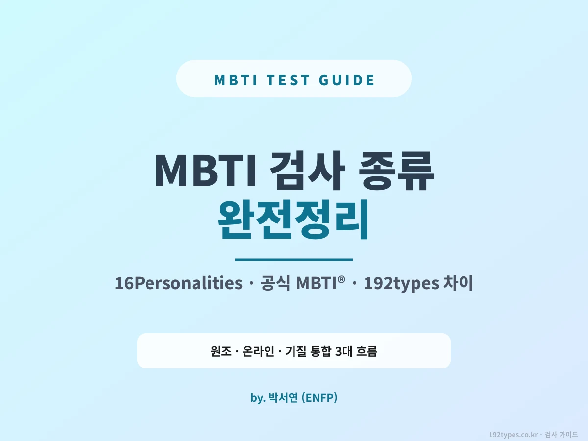 이 글은 그 5대 MBTI 계열 검사의 차이를 한 번에 정리한 가이드야. 각각의 개발 배경·문항 수·정확도·장단점·어떤 목적엔 뭘 써야 하는지 명확히. 왜 공식 MBTI®는 15만원인지, 왜 16Personalities는 무료인지, 왜 192types는 기질까지 보는지. 이 글 읽고 나면 친구한테 "MBTI 했어?"라고 묻지 않고 "어떤 MBTI 검사 했어?"라고 물을 수 있게 될 거야. 그 한 질문으로 대화 수준이 확 올라가.