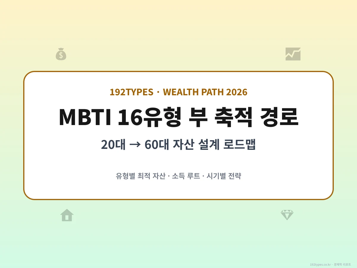 이 글은 16유형별 부 축적 최적 경로의 완전 지도야. 16유형 소득 루트 + 주 자산 테이블, 4기질별 자산 배분 모델(NT vs NF vs SJ vs SP), 20~60대 5단계 타임라인, 16유형 재정 리스크 매트릭스(감정 소비 위험도), 기질별 20년 로드맵까지. MBTI 재테크 DNA 완전 분석이 "개별 투자 스타일"이라면 이 글은 "일생 부 설계 로드맵"이야.