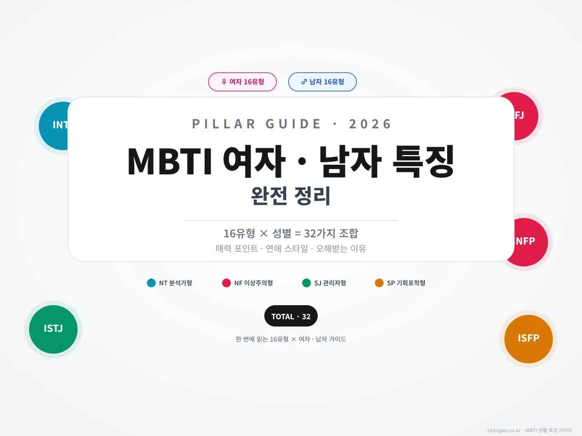 근데 문제가 하나 있어. "ENFP 여자 특징" 치면 글이 쏟아지는데, 막상 읽으면 내 유형만 보고 끝나. 그 유형이 남자일 땐 어떻게 달라지는지, 같은 기질의 다른 유형은 어떤 결이 같은지까지는 안 묶어줘. 그래서 내가 32가지(16유형 × 여자/남자)를 한 번에 비교해서 정리했어. 192가지 성격 유형 검사 사이트 운영하면서 축적한 유형별 글 28개를 NT·NF·SJ·SP 4기질로 묶고, 각 유형 아래에 [여자 특징 상세 글]과 [남자 특징 상세 글]을 링크로 연결해뒀어.