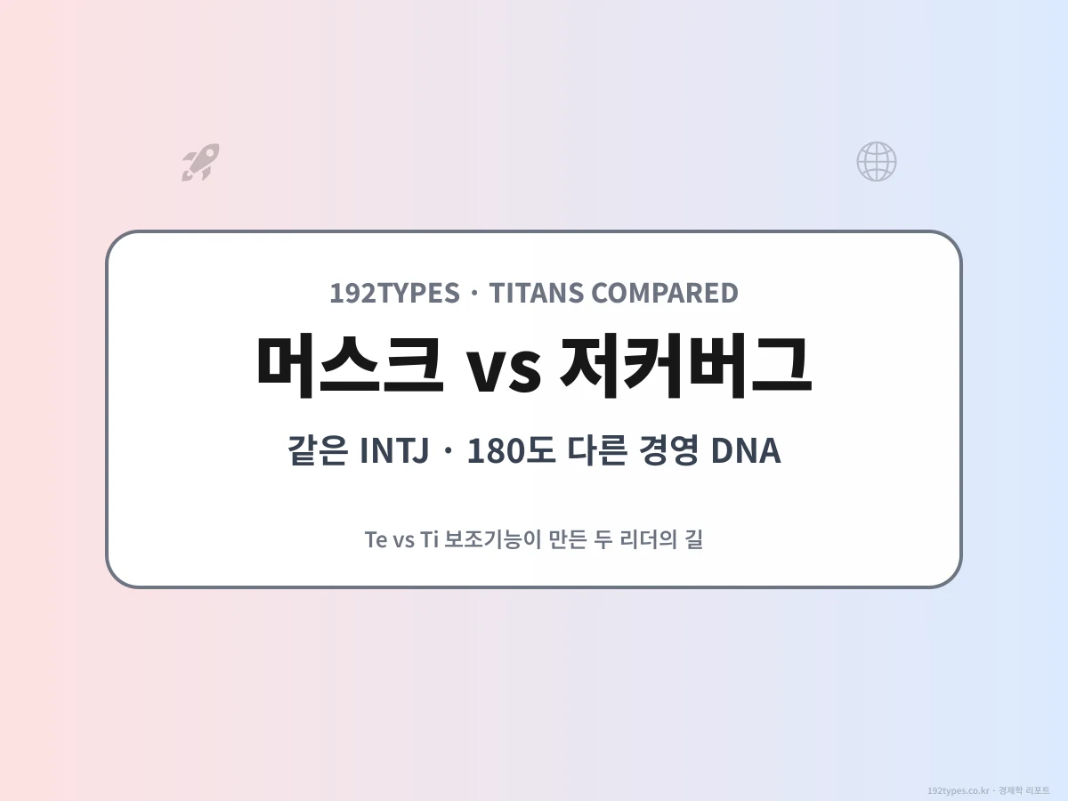 머스크와 저커버그 둘 다 INTJ 추정인데 경영 스타일은 정반대. Ni+Te(머스크) vs Ni+Ti(저커버그) 보조기능이 만든 결정 프로세스, 리스크 허용도, 실패 대응 차이를 해부했어. Te형 vs Ti형 INTJ 중 너는 어느 쪽?